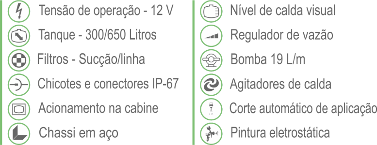 Disponibilizados tanto com bomba elétrica quanto com bomba hidráulica, com diferentes capacidades volumétricas de calda, atendendo a necessidade de cada produtor.